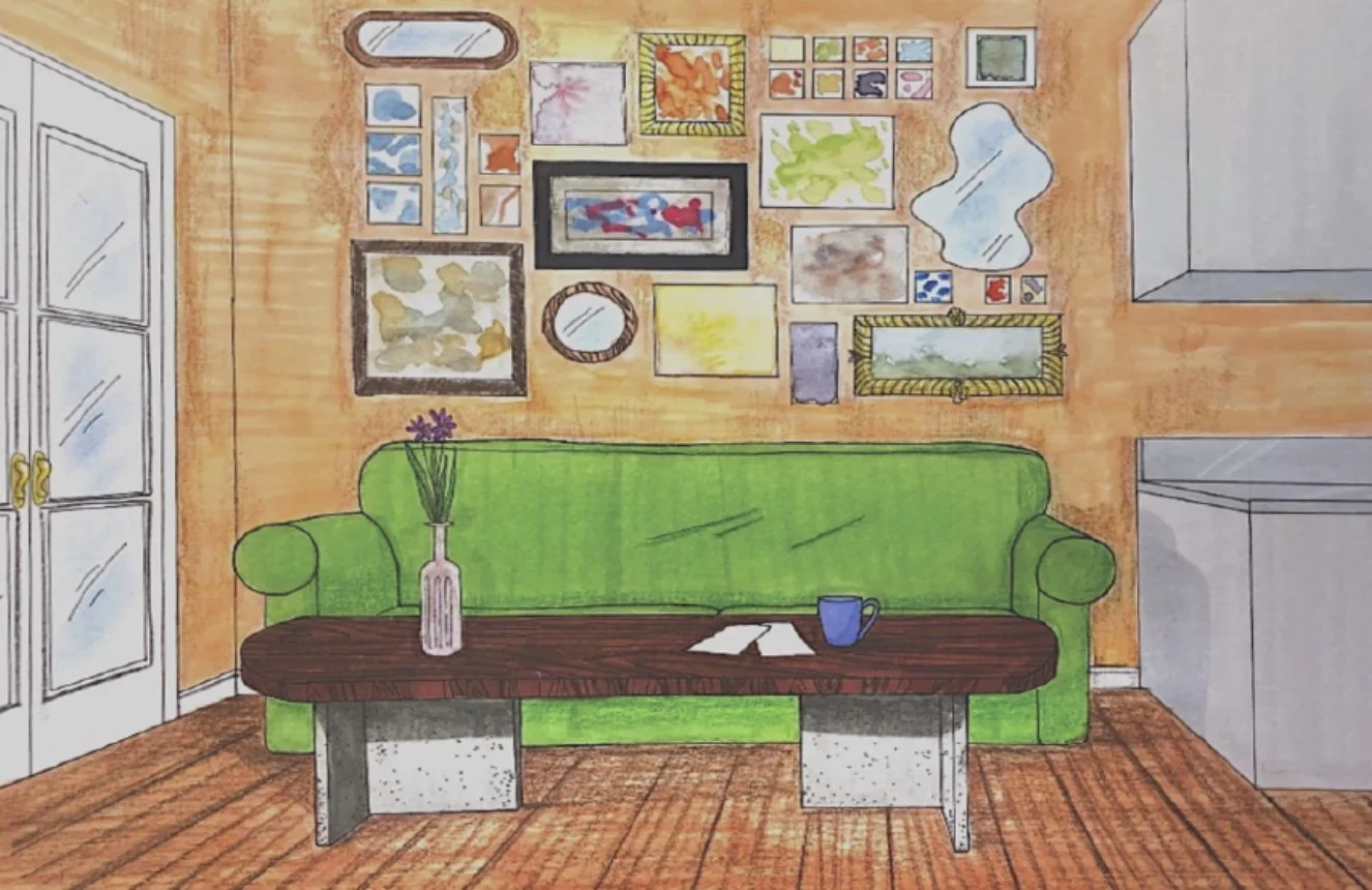 Each rendering was lined in pencil and ink. Markers, chalk pastels, and watercolors were used as base layers while colored pencils were added last for texture. Finally, photoshop was used lightly to enhance the saturation of the furniture.